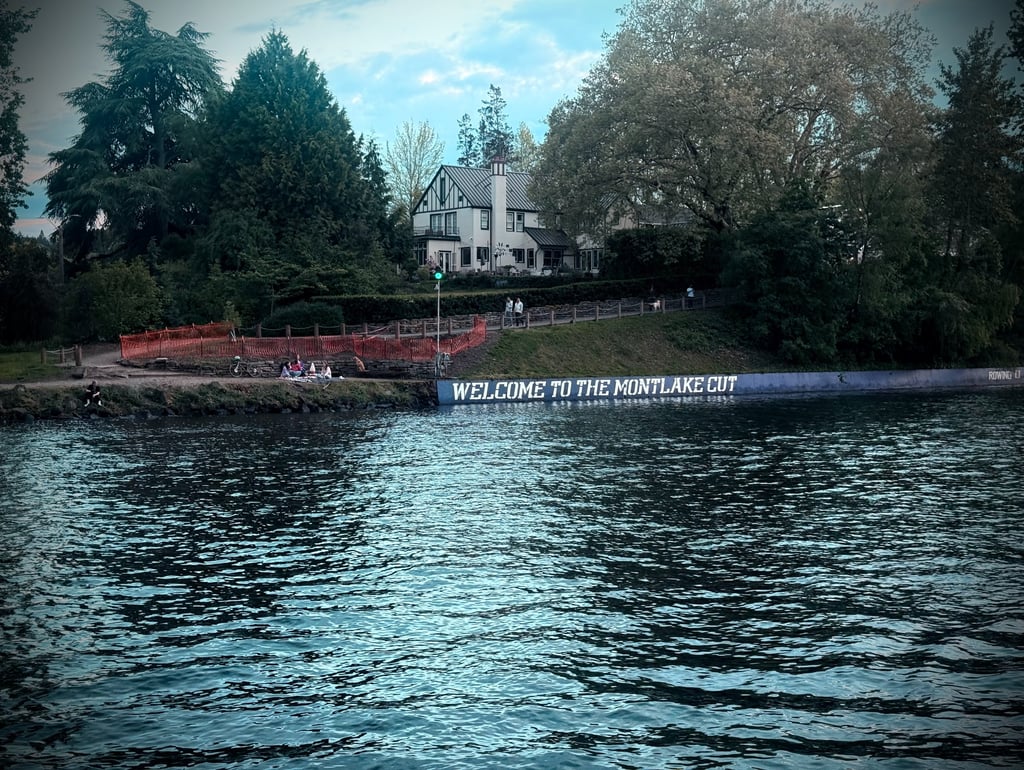 First, the mass of rowing shells row back through the cut, then detour back to the UW boathouse.